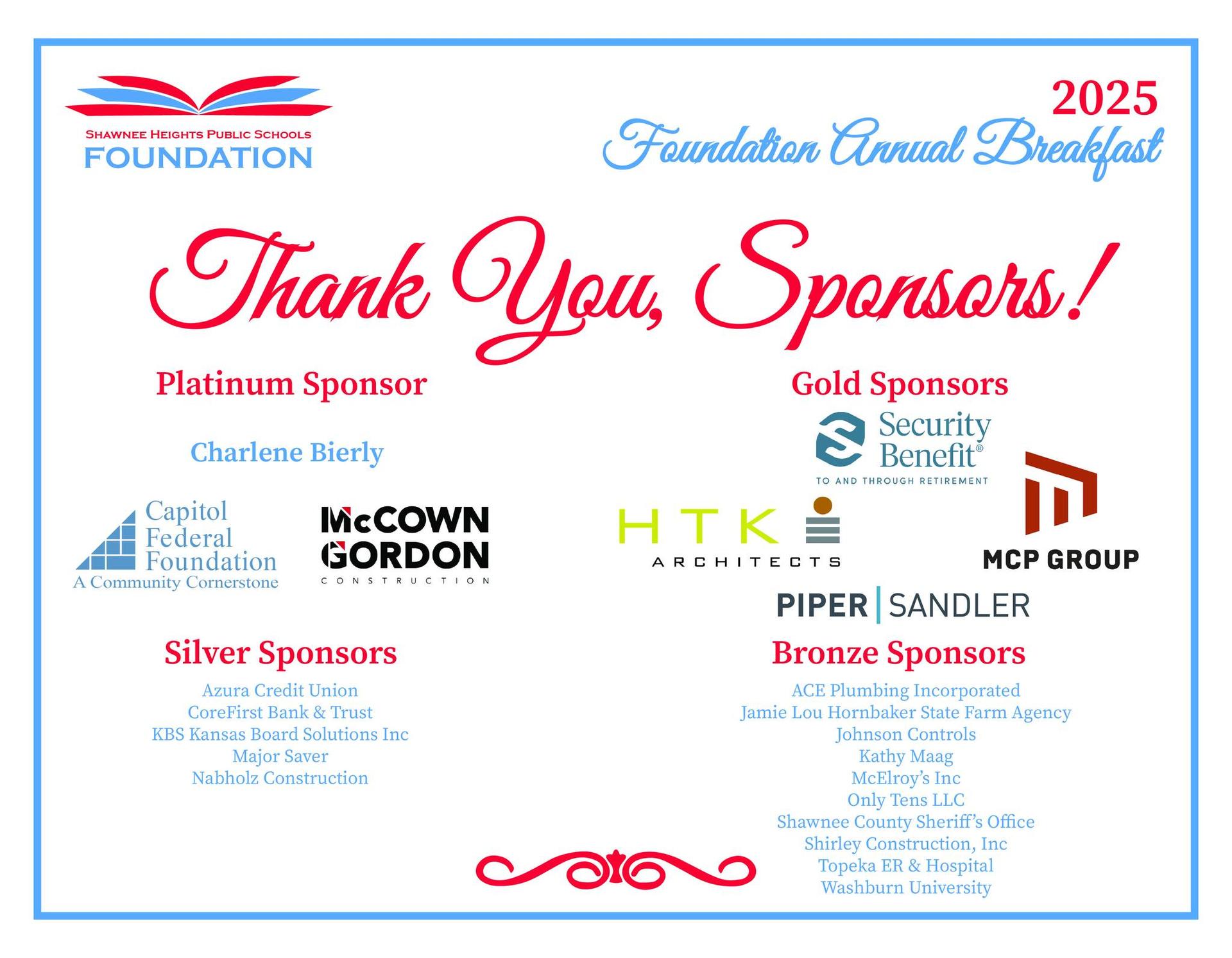 The Shawnee Heights Public Schools Foundation extends its gratitude to all sponsors for their continued investment in students and staff. Your generosity makes these opportunities possible and helps elevate education throughout Shawnee Heights. |