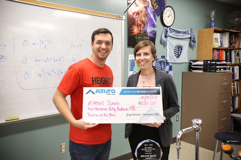 Mitchell, a physics teacher at Shawnee Heights High School, brings enthusiasm and energy to his classroom and beyond. He's one of the first faces our freshmen meet as he leads the Link Crew opening assembly, setting a welcoming tone that helps new students feel part of the T-Bird family. He also coaches girls' JV soccer, supports the Renaissance Club, and volunteers at soccer camps, showing his dedication to building community and inspiring students.